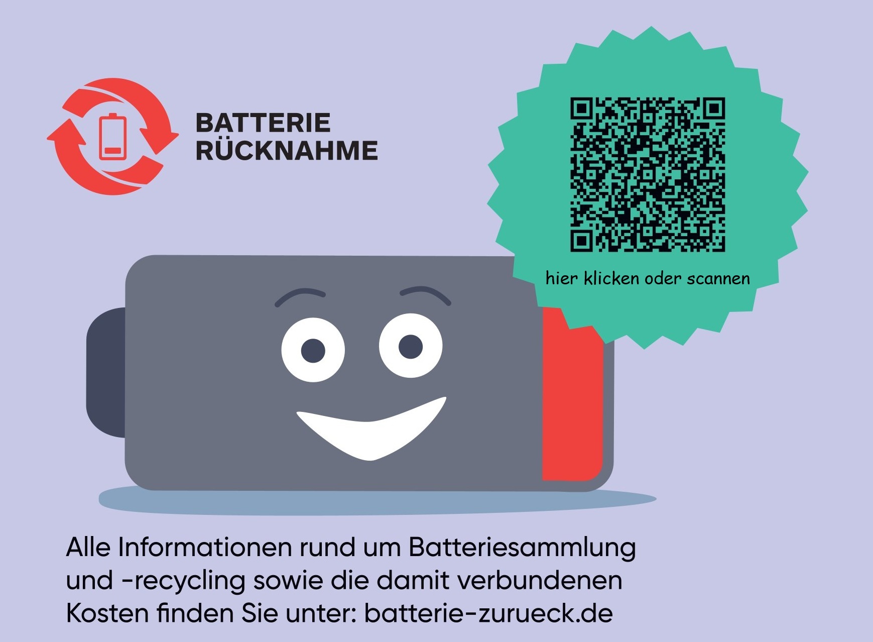 Jeder Verbraucher ist nach dem Elektro- und Elektronikgerätegesetz verpflichtet, Elektro- und Elektronikaltgeräte (Altgeräte) ordnungsgemäß und getrennt vom Hausmüll zu entsorgen. Altbatterien, Altakkumulatoren (Akkus) und Lampen, die aus dem Altgerät entnommen werden können, müssen getrennt abgegeben werden. (§ 10,1 ElektroG zum 01.01.2022)